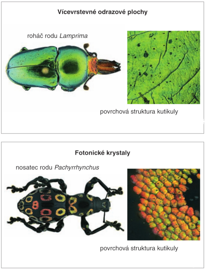 - Vyvolání optických efektů – lesk, metalický vzhled, měnící se barva při úhlu pohledu (iridescence) díky strukturálním efektům.