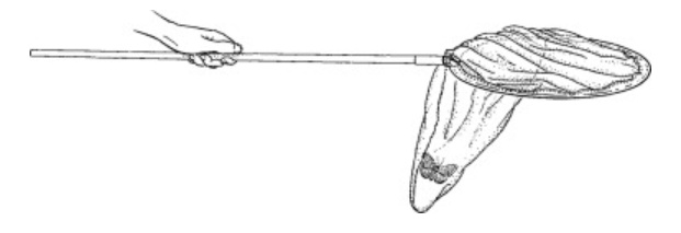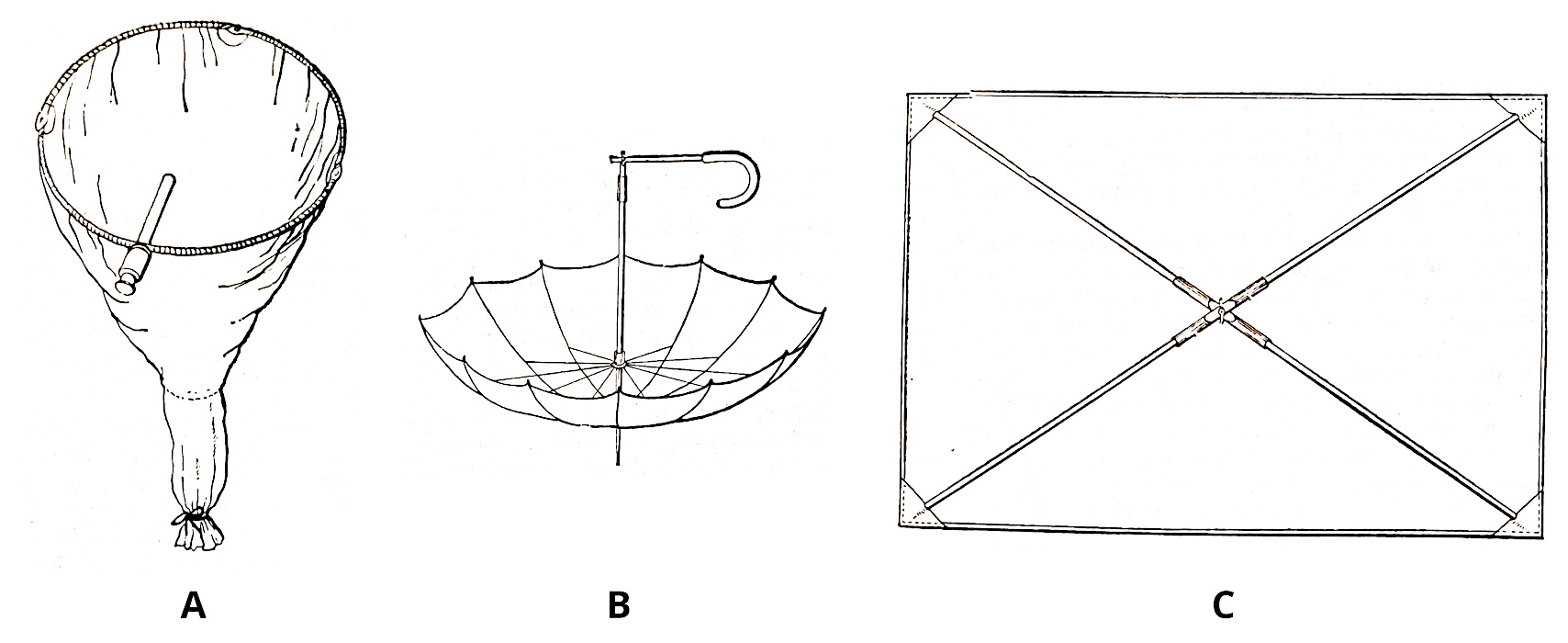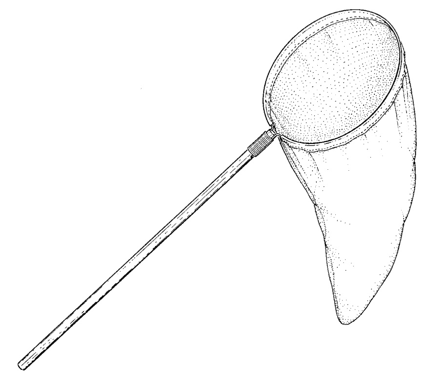 - síťové, vypadající jako smýkačka s velkým průměrem rámu a velmi mělkým plátěným pytlem; držadlo smýkačky směřuje do středu rámu