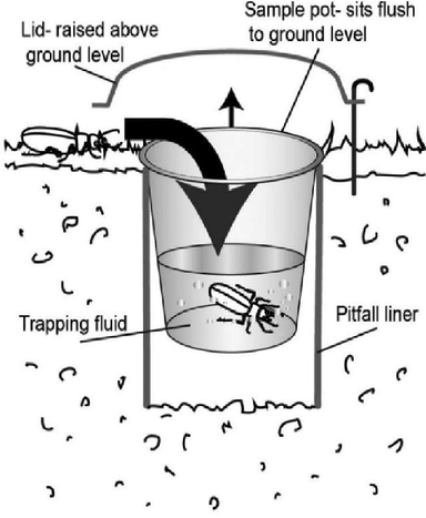 Zemní pasti se používají především na brouky, kteří lezou po zemi. Konstrukčně je to vždy nějaká nádoba, zakopaná až po hrdlo v zemi. Používané nádoby jsou obvykle plastové a velmi často se k tomuto účelu využívají plastové kelímky na nápoje. Doporučuji používat kelímky o objemu 500 ml, přičemž se vždy 2 kelímky zasunou do sebe. Tím se velmi usnadní operace při kontrole a pravidelném výběru pastí. Při kontrole potom stačí vnitřní kelímek vysunout, obsah přemístit do přepravní nádoby, obnovit nástrahu i fixační tekutinu a kelímek znovu zasunout na původní místo. Pokud se používají menší kelímky (200 – 300 ml), je to ve většině případů při kladení zemních pastí do měkkého podloží (např. do písku) a v takovém případě se pastí pokládá větší počet. Kromě samotných kelímků je u zemních pastí ještě důležité umístění atraktantu tak, aby nemohl znehodnotit odchycené jedince, dále umístění ochranné síťky jako ochrana menších živočichů, kteří by mohli do pasti spadnout a konečně vhodné maskování pasti jako ochrana proti nežádoucí manipulaci s pastí (ať už od lidí nebo větší zvěře).