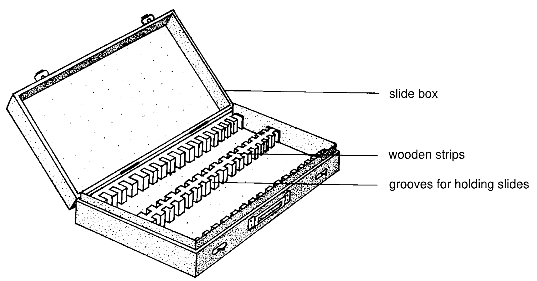 Mikroskopické preparáty se obvykle skladují v dřevěných nebo plastových krabicích. Vnitřní strany krabic jsou opatřeny drážkami, které umožňují vertikální uchycení preparátů a jejich vzájemné oddělení. Krabičky na preparáty jsou k dispozici ve velikostech určených pro 50 až 100, někdy i více preparátů.