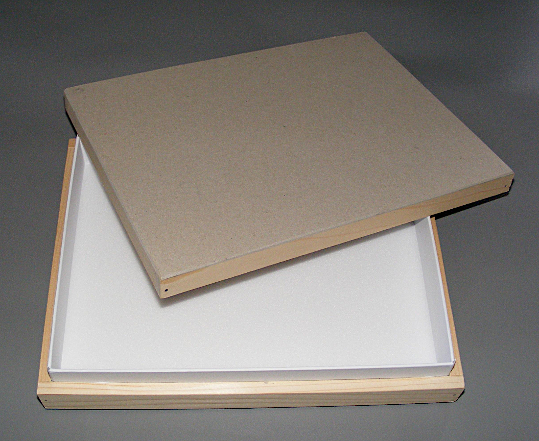 - Korpusu (který je obvykle z lehkého dřeva, překližky nebo pevného kartonu; nemusí být tak robustní jako u transportních nebo entomologických krabic; důležitá je nízká hmotnost, snadná stohovatelnost a levná výroba),