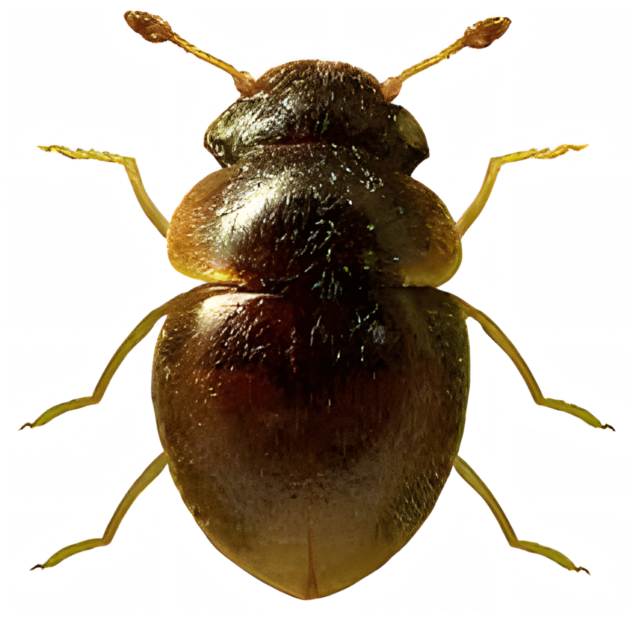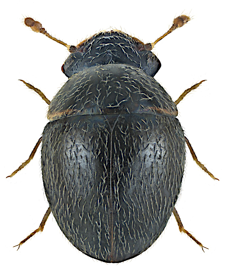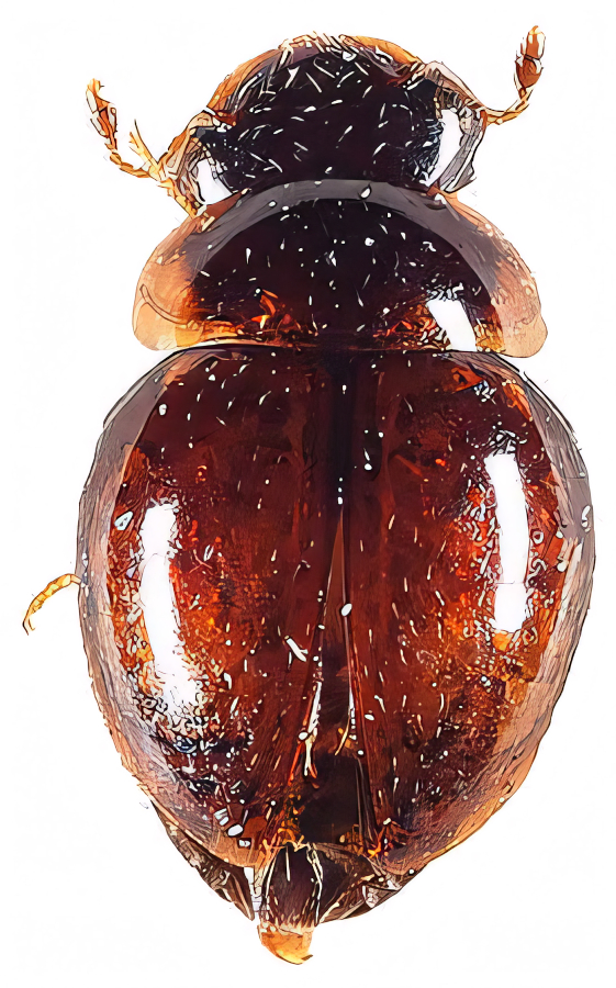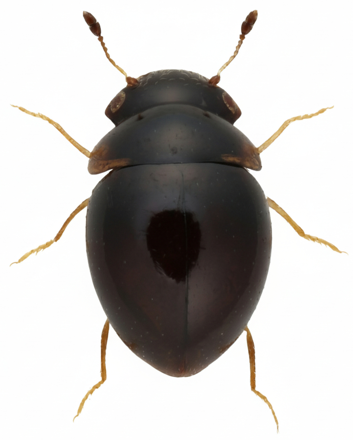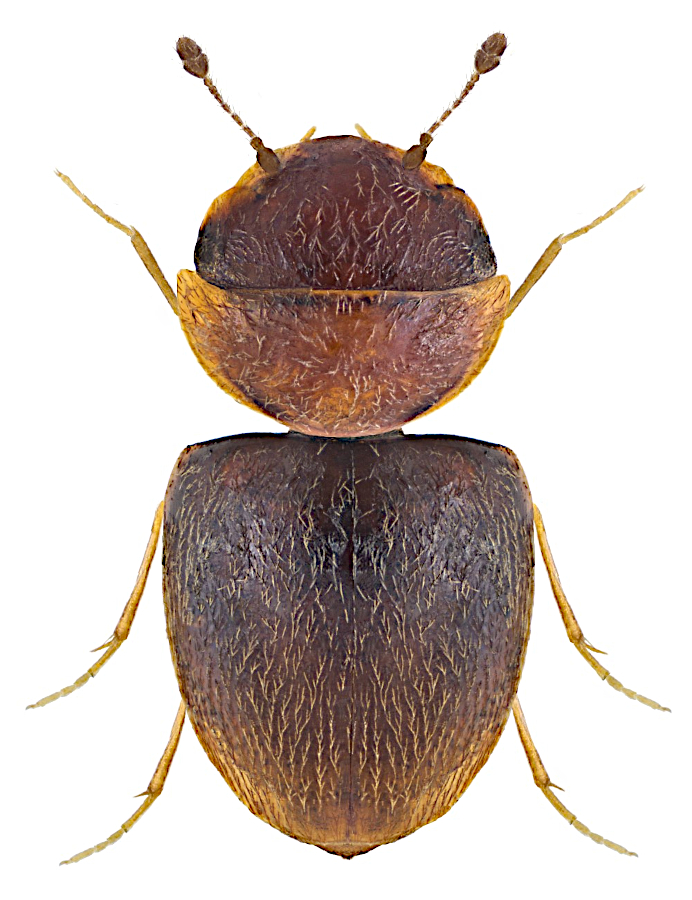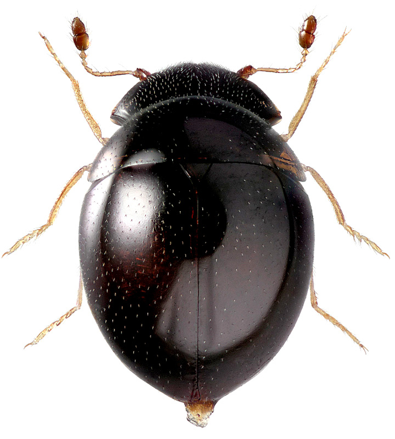 The family Clambidae includes very small, inconspicuous beetles that are often overlooked for their size. Their bodies are very small, usually ranging from about 0.7 to 2.0 mm in length. The hind pair of wings often has a fringe lined with long hairs, giving them the name "fringe-winged beetles". Most species live in decaying plant material (macro and microdetritus), in humus, under bark, in tree cavities, in leaves, etc. They are thought to feed on fungal spores, hyphae (Myxomycetes) and spores of various fungal species (Ascomycetes). When threatened, the beetles may reflexively retract their legs, head, and shield ("roll up") into a nearly spherical shape, minimizing the risk of mechanical damage. They have greatly enlarged metacoxal plates that can cover the hind legs. The eyes in some species are often partially or completely interrupted by the canthus (i.e., eyes divided). Because of their size, they are easily overlooked and their biology is in many ways poorly understood.