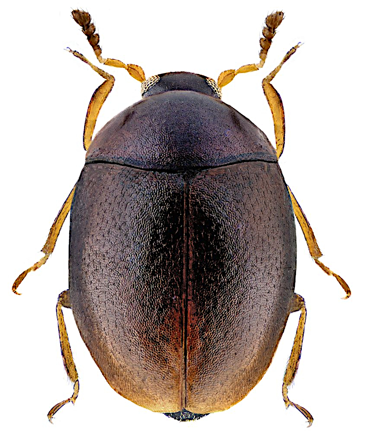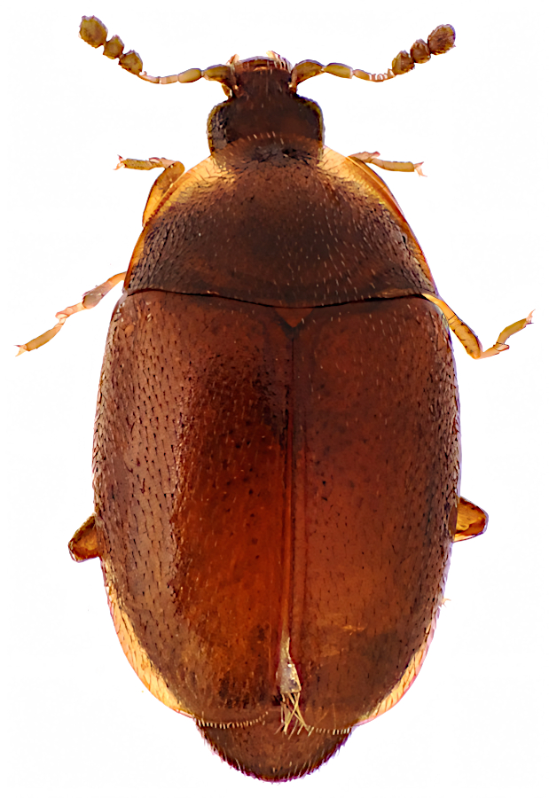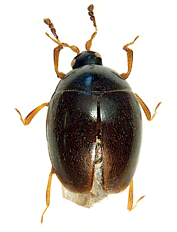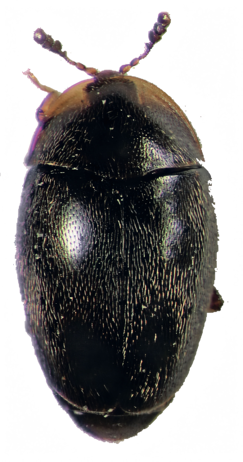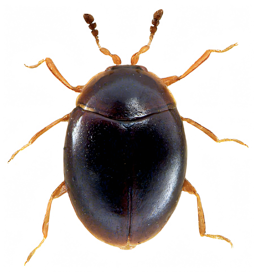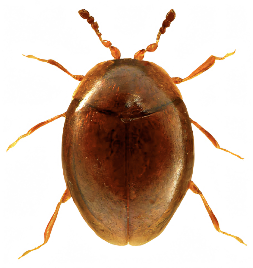 The family Corylophidae comprises some of the smallest wild insects on Earth. It is a cosmopolitan family, comprising approximately 28 genera and around 300 described species with a global distribution. Individuals usually measure only a fraction of a millimetre to a few millimetres (typically around 0.5–2 mm) and have a characteristic ‘hooded’ appearance – the front part of the body (pronotum) often extends beyond the head so that it is almost hidden from above. They are mycophagous in both the larval and adult stages – feeding on moulds and yeasts growing on decaying organic matter. They inhabit damp habitats with an abundance of decaying wood, leaves or hay, and can be found under tree bark, in leaf litter, in hay or in herbivore droppings. They are ecologically important as decomposers of microbial biomass, yet are often poorly recorded due to their size and hidden lifestyle.