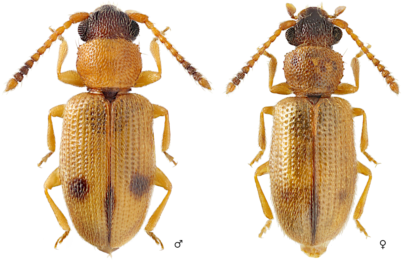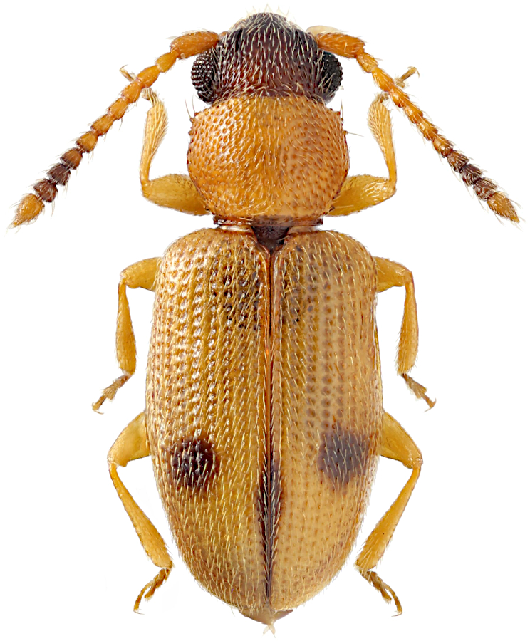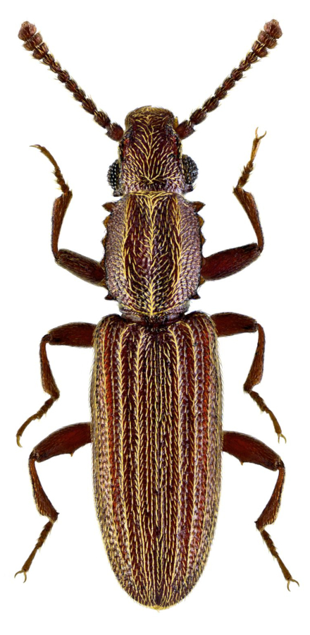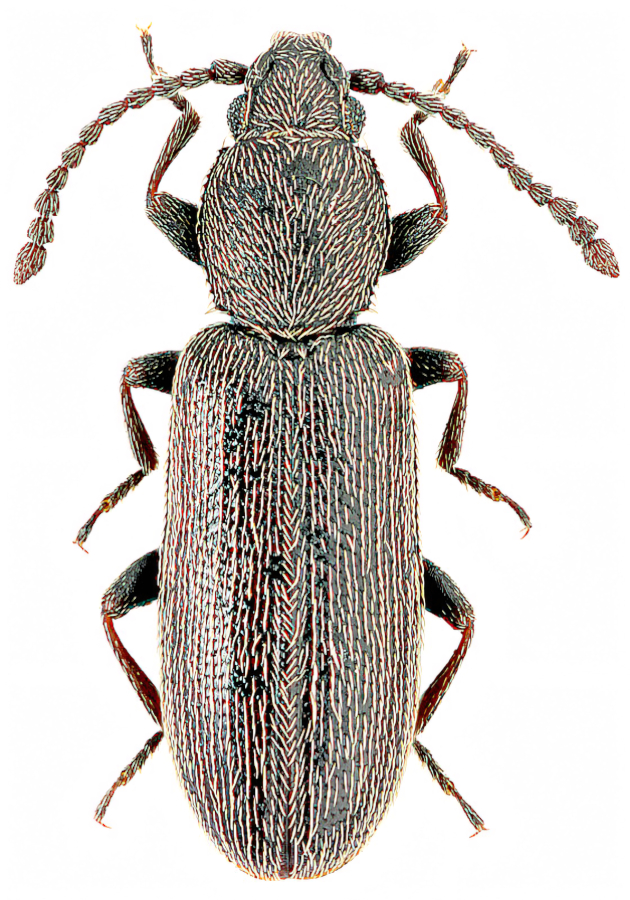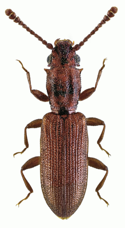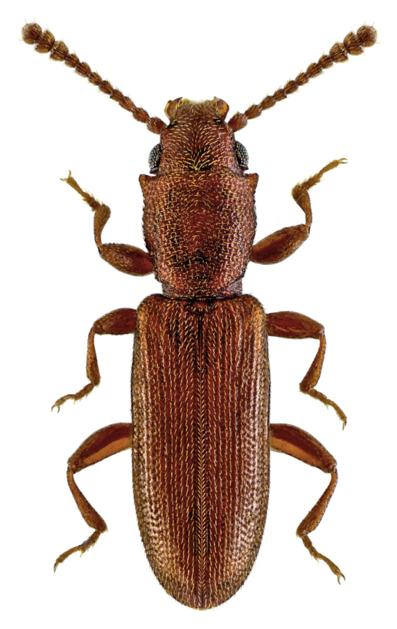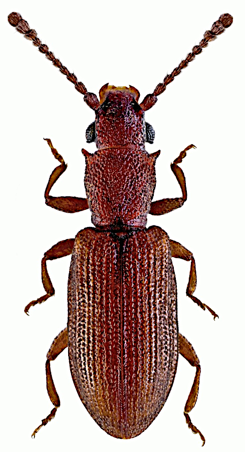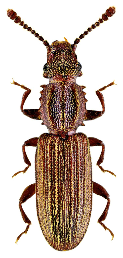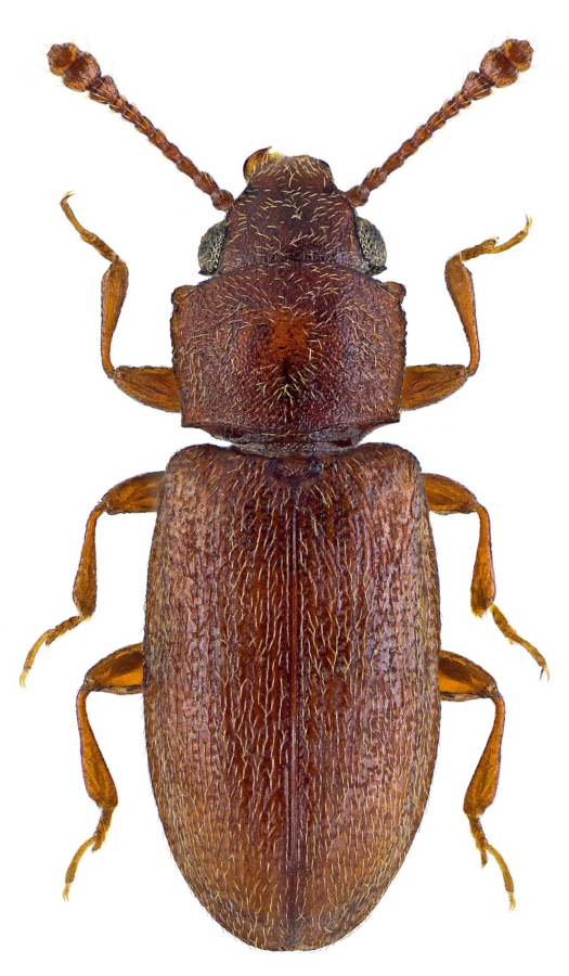 Silvanidae is a relatively small but ecologically and economically significant family of beetles. Its members are small, dorsoventrally flattened beetles, brown or rust-coloured, hairy and densely spotted. Most species live under the bark of dead or damaged trees and feed on moulds and fungi. The family has a cosmopolitan distribution – it is found on every continent except Antarctica, with the greatest species and genus diversity occurring in the tropics of the Old World. Alongside many forest and saproxylic species, the family includes several economically significant pests of stored foodstuffs, which have spread worldwide through trade.