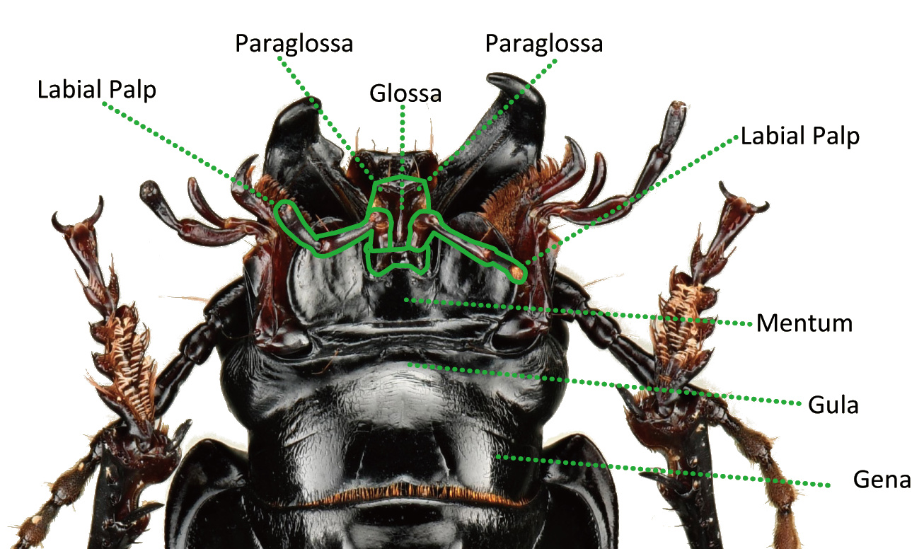 The labium is attached at the rear end of the structure called cibarium, and its broad basal portion is divided into regions called the submentum, which is the proximal part, the mentum in the middle, and the prementum, which is the distal section, and furthest anterior.