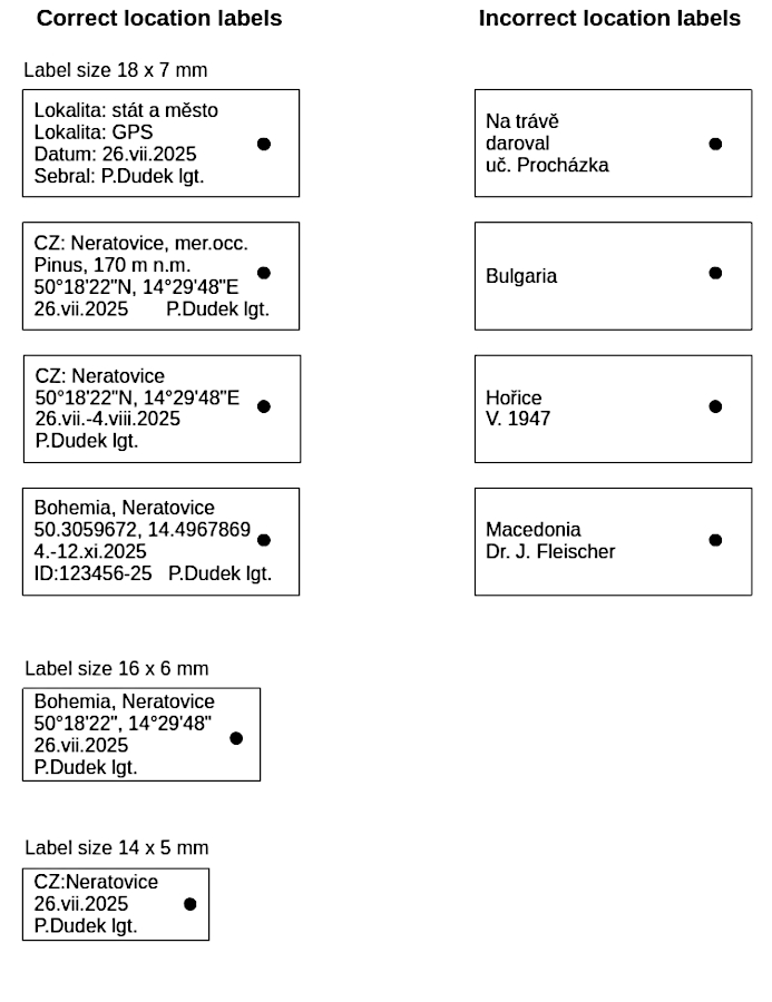There is no standard regarding the size of locality labels. However, the unwritten rule is that the locality label should not be much larger than the adhesive label with the specimen itself. In the literature you will usually find a recommendation that the maximum size for a locality label is 7 x 18 mm. Today, locality labels are most commonly printed on printers. The recommended font size is 3pt and a legible, preferably sans serif font such as Calibri or Verdana in Windows or Ubuntu, Liberation Sans or Dejavu Sans in Linux.